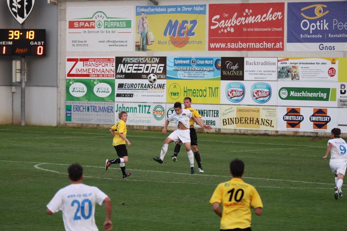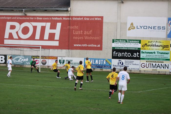 In der 41. Minute lief Christian Schadler durch die gegnerischen Abwehrreihen und passte von der linken Seite zur Mitte, ein Frannacher Verteidiger köpfelte den Ball zur Ecke. Zwei Minuten darauf konnte Frannachs Keeper Harmuss einen von Matthias Schadler getretenen Freistoß zur Ecke abwehren. Und wenige Sekunden vor dem Pausenpfiff tankte sich Daniel Haas an der Toroutline durch, sein Schuss zog knapp am langen Eck vorbei ins Torout. Verdiente 1:0-Pausenführung für Gnas in einem ansprechenden, flotten und abwechslungsreichen Match.