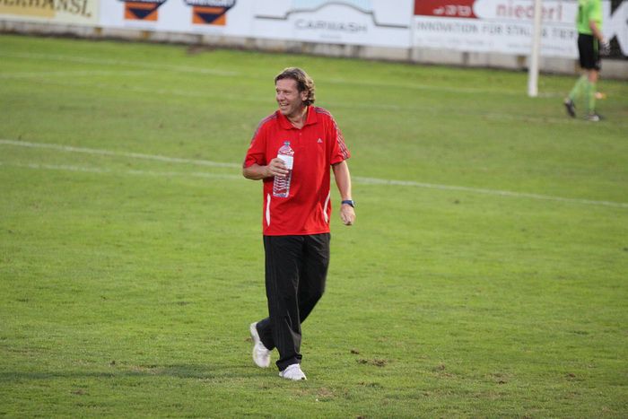 Frannach-Trainer Kohlbacher kehrt nach der Pause gutgelaunt zur Betreuerbank zurück.