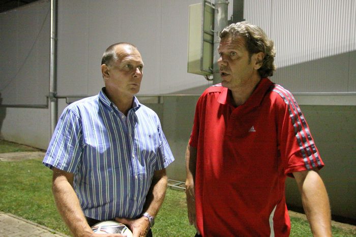 Frannach-Trainer Kohlbacher im Gespräch mit Gnas-Präsident Schwarz, der an diesem Tag den 55. Geburtstag feierte..