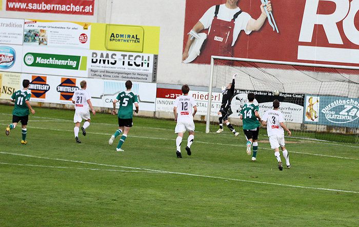 Zwei Riesenchancen hintereinander hatten die Gnaser nach einem Eckball in der 78. Minute. Den Kopfball von Rene Obendrauf wehrte der starke Tormann Martin Walcher ab, der zweite Kopfball von Christian Schadler konnte von einem Gegenspieler gerade noch auf der Torlinie weggeschlagen werden.