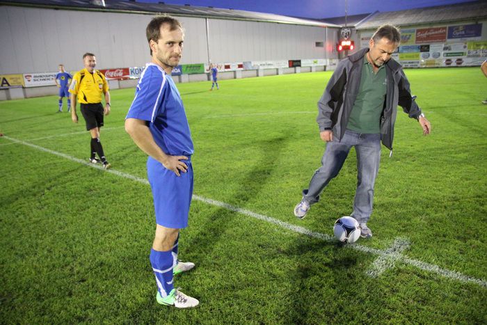 Gerhard Wohlmuth nimmt den Ehrenanstoß vor. Links Kapitän Mag. Pichlbauer.