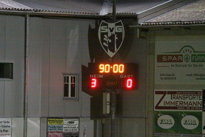 In der 80. Minute krönte Christian Fink seine tolle Leistung mit dem Tor zum 3:0. Den abgewehrten Ball eines Gegenspielers nahm Fink an und zog aus rund 20 m mit dem linken Fuß ab. Einen Augenblick später zappelte das Leder im rechten Eck. Damit war das Spiel entschieden und die Gnaser um drei Punkte reicher. Ein verdienter Sieg der Bez-Truppe aufgrund der guten Leistung in der zweiten Halbzeit. Übrigens, das Eckenverhältnis lautete am Ende 11:3 für Gnas.