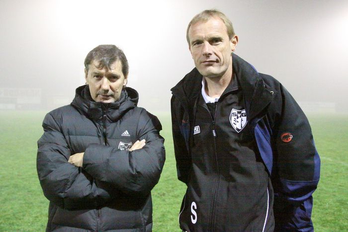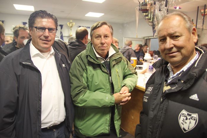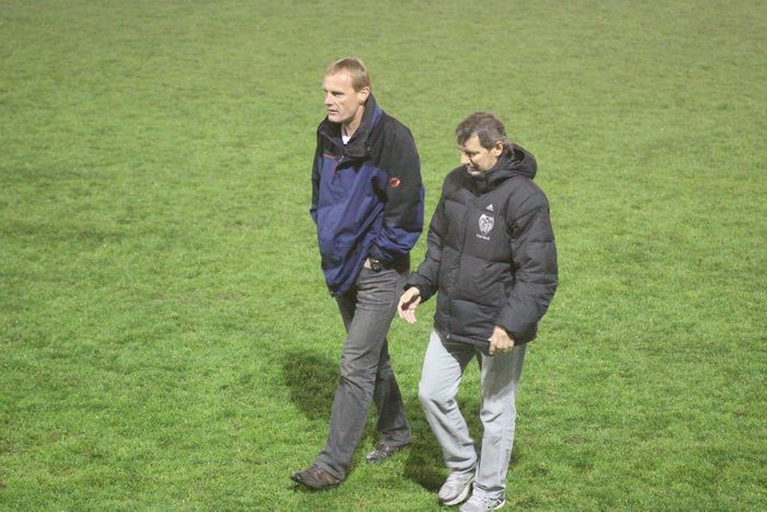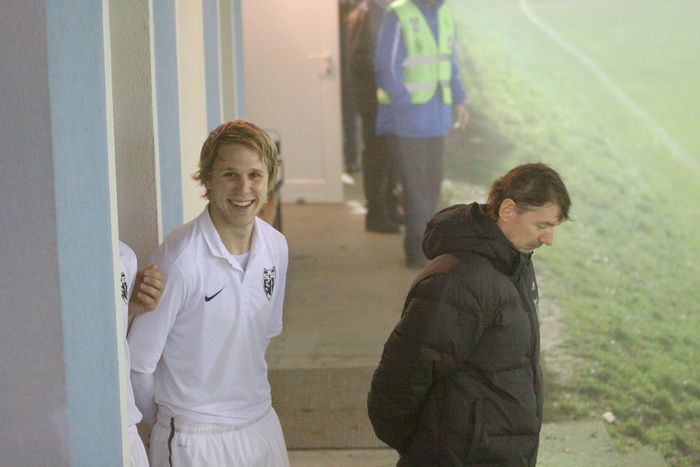 Ein sichtlich gut gelaunter Gnas-Verteidiger Klenner und ein nachdenklicher Gnas-Trainer Bez kommen aus der Kabine.