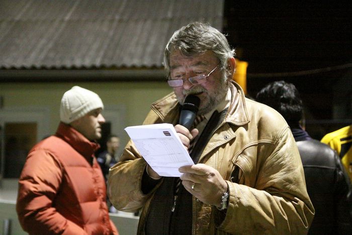 Platzsprecher Dir. Walzl gibt die Mannschaftsaufstellungen bekannt.