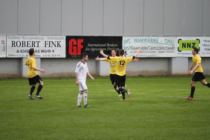 In den ersten Minuten gab es gegenseitiges Abtasten, es spielte sich alles im Mittelfeld ab. Doch nach 8 Minuten änderte sich bereits das Bild entscheidend. Gnas-Mittelfeldspieler Heiko Wohlmuth spielte einen Querpass nach links zu Matthias Schadler. Schadler beförderte den Ball halbhoch in Richtung Gleichenberg-Strafraum. Rene Obendrauf nahm den Ball an und setzte ihn neben Goalie Rudman ins linke Eck. 1:0 und großer Jubel um den Torschützen.