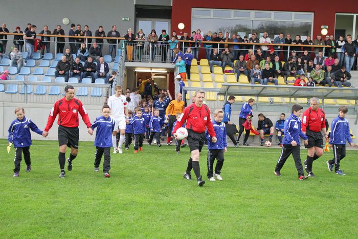 Diesmal wird auch das Schiedsrichterteam von Kindern begleitet.