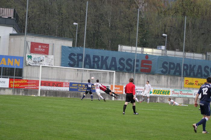 Pöllau-Schlussmann Miljkovic befördert einen Freistoßball von Christoph Haas (rechts) über die Querlatte (77.).